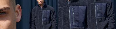 100% recycled polyester sherpa. 65% polyester/35% cotton twill panelling. Fully lined. Contrast funnel collar and back yoke. Full length zip. Left chest zip pocket. Two front pockets with stud closure. Curved hem with drawcord. Flatlock stitched panels. Access for decoration. Tag free.