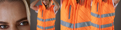 Quilted polyester outer. Fleece lining. Yellow and orange conform to EN ISO 20471: 2013 + A1: 2016 class 2. RIS-3279-TOM (orange only). Navy provides enhanced visibility. Showerproof. Grown on hood with bound opening. Full length zip with chin guard and inner zip guard. Right chest zip pocket. Bound elasticated armholes and hem with reflective piping. Two angled reflective bands around the body. Two front fleece lined zip pockets. Large inner pocket. Access for decoration.