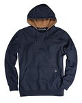 9.25 oz., 55% cotton 45% polyester heathered fleece; 1x1 yarndyed cuffs and waist; Lapover neckline with contrast lined hood; Set-on pouch pocket;
