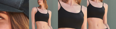 48% regenerated cotton/47% recycled polyester/5% elastane. Single jersey. Cropped bralette style. Adjustable spaghetti straps. Bound neck and armholes. Double layer front. Concealed elasticated band. Unbranded size label. Slight flecks are a natural result of the manufacturing process.