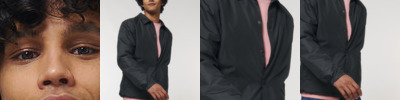 Set-in sleeve. 1x1 rib at neck collar, sleeve hem and bottom hem. Shoulder placket with 1 snap in matching body colour and 1 hidden snap for easy dressing. Inside back neck tape in single Jersey. Self-fabric half-moon at back neck. Single-needle topstitch at neck collar. Sleeve hem and bottom hem with twin-needle topstitch.
