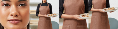 100% Fairtrade certified organic cotton. Neckband with gunmetal adjustable buckle - brown denim has antique brass buckle. Two front pockets with contrast stitching. Self fabric 107cm ties. Width 72cm. Length 80cm. Domestic wash 40°C.