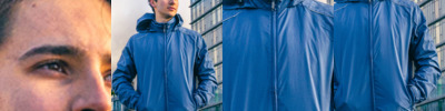 Recycled nylon outer. Recycled polyester lining and padding. Easy care fabric. Shower resistant. Lightweight. Full length zip. Two front zip pockets. Inner pocket. Packs away into stuff sack. Zip access for decoration.