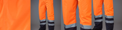 100% waterproof 300D polyester with oxford PU coating. Conforms to EN ISO 20471: 2013 + A1: 2016 class 1 and EN343. RIS-3279-TOM (orange only). Waterproof with taped seams. Elasticated waistband. Two side pockets. Two reflective bands around lower legs. Contrast lower legs. Open leg ends with stud adjusters.