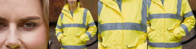 300D polyester outer. Mesh lining. Conforms to EN ISO 20471: 2013 + A1: 2016 class 3, EN343: class 3:3. Waterproof with taped seams. Windproof and breathable. Concealed hood. Heavy duty two way zip with tear release storm flap. Two reflective bands around the body, sleeves and one over each shoulder. Part elasticated waist. Two angled front pockets with tear release flaps and reflective piping. Inner pocket. Tear release adjustable cuffs. Access for decoration.