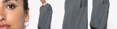 85% organic ringspun combed cotton/15% recycled polyester. Brushed back fleece. Drop shoulder style. Oversized fit. 2x1 ribbed collar, cuffs and hem. Herringbone taped neck. Half moon back yoke. Twin needle stitching. Tag free. Recycled polyester is made from post-consumer waste.