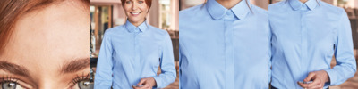 57% polyester/39% cotton/4% elastane. Easy care stretch fabric. Semi-fitted. Rounded collar. Concealed placket. Princess seams. Back yoke. Single button cuffs. Curved hem. Available in short sleeve BK133.