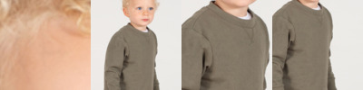 60% regenerated cotton/40% recycled polyester. Brushed back fleece. Drop shoulder style. Ribbed collar, cuffs and hem. V detail at front neck. Taped neck. Sizes 0-6m - 24-36m have YKK popper closure on shoulder. Tag free. Slight flecks are a natural result of the manufacturing process.