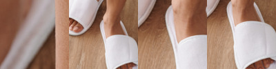 100% polyester terry/mixed fibre sole. Open toe. Adjustable tear release top closure. Padded sole.