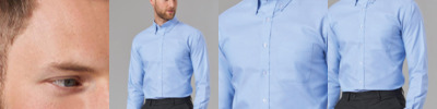 100% cotton. Tailored fit. Button down collar. Clear buttons. Left chest pocket. Back yoke. Pleated back panel. Two button adjustable cuffs with button on cuff gauntlet. Curved hem.
