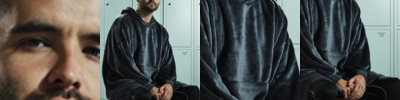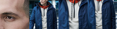 - Three-piece hood with elastic binding at the opening and a scuba collar