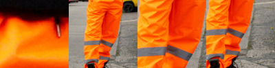 300D polyester with PU coating. Conforms to EN ISO 20471: 2013 class 1, EN343: Class 3.1. RIS-3279-TOM (orange only). Waterproof. Elasticated waistband. Side access slits. Two reflective bands around legs. Open leg ends with stud adjusters. Branding on right pocket.