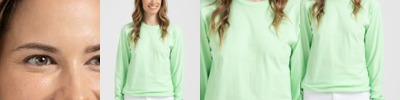 * 7.6 ounce 55% polyester/41% cotton/4% rayon, super soft fleece * Ladies' fit * Woven label * Exterior faux leather logo loop label * Contrast color V insert at center front neck * Raglan sleeves * Rib-knit collar, cuffs and bottom band