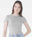 Athletic heather 90% airlume combed ringspun cotton/10% polyester. Pre-shrunk. Fitted style. 1x1 micro rib. Bound contrast neckline. Contrast cap sleeves. Side seams. Cropped length. Tear out label.