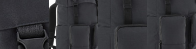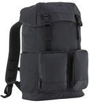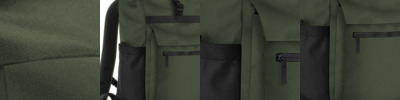 100% recycled 900D polyester/100% recycled 1680D polyester. Padded adjustable shoulder straps. Main compartment with roll-top closure. Rear padded laptop compartment, compatible up to 16". Front slip pocket with magnetic closure. Side pockets. Front zip pocket. PU zip pulls. Rear luggage strap. Tear out label. Capacity 22 litres.