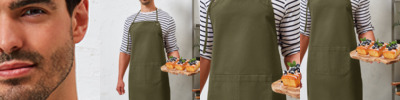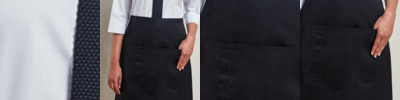 60% cotton/40% recycled polyester CVC. Easy care fabric. Heavyweight canvas material. Eyelet detail for adjustable knotted neckband. Double front pocket. Eyelets with rounded corners. Self fabric 90cm ties. Width 72cm. Length 86cm. Can be worn as a full bib or half waist apron. Domestic wash 40°C.