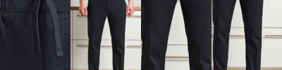 65% recycled polyester/35% cotton twill. Easy care fabric. Lightweight. Elasticated waistband with drawcord. Mock fly. Right thigh and rear pocket. Tapered lower leg with optional turn-up hems. Domestic wash 60°C.