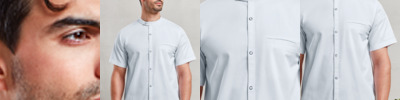 65% recycled polyester/35% cotton twill. Lightweight. Modern fit. Mandarin collar stand. Contrast neck tape. Press stud closure. Left sleeve pen pocket. Left chest pocket. Domestic wash 60°C.