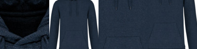 80% cotton/20% polyester. Soft cotton faced fabric. Brushed back fleece. Drop shoulder style. Honeycomb lined hood with chunky flat lace drawcord. Taped neck. Full length zip. Front pouch pockets. Ribbed cuffs, hem and pocket edges.