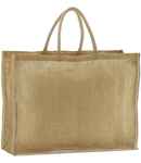 Unlaminated starched jute. Cotton carry handles (40cm long). Cut out label. Capacity 14 litres.