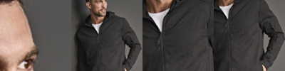 60% ringspun combed cotton/40% polyester. Brushed back fleece. Drop shoulder style. Taped neck. Full length SBS zip. Left sleeve zip pocket. Two front pockets. Self fabric cuffs. Elastic taped hood and hem.