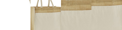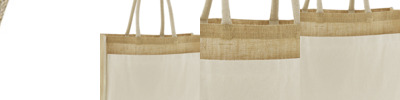 Unlaminated starched jute. Cotton carry handles (35cm long). Cut out label. Capacity 6 litres.