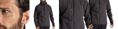 EN343-3.3 AquaDry membrane recycled polyester stretch ripstop with H2OShield DWR, polyester elastane stretch mesh and recycled polyester taffeta lining. Recycled zip tape to all zips except centre front and chest pocket zips. GRS certified fabrics, ETI factories, REACH compliant.