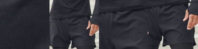 Men’s double-layer sports shorts with four-way stretch. Microfibre top short and polyester interlock under short. Side zipped welt pockets. Self-fabric elasticated waistband with inner drawcord. Side vents. Integrated under short. Phone pocket on under short, right-hand side when worn with media access. WIcking properties on under short. Tear-out label.