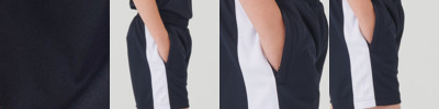 100% polyester interlock. Elasticated waistband with fixed inner drawcord. Two side zip pockets. Contrast side panels (black and navy are self colour). Twin needle stitching. Tear out label.