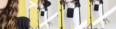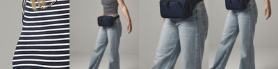 Adjustable webbing belt with secure clip fastener. Headphone port. Zippered rear pocket. Large zippered main pocket. Internal mesh pocket. Key hook.