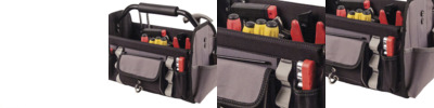 Soft shell open tool bag with collapsible sides and removable PVC base. Provides easy access of all contents. Incorporates a strengthened bar with cushion grip for ease of mobility. Features 4 open pouches, 1 covered pocket, 1 d-ring, 6 outer attachment loops and 14 inner attachment loops.
