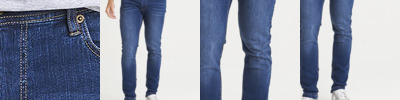 Slim fit. Stretch denim. 5 pocket styling. Light blasting & whiskering (blue washes only). Self-fabric belt loops. Shank button and YKK zip fly fastening. Metal rivet detail at pocket corners. Twin needle stitching detail.