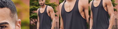 Shaped work out vest, lightweight soft hand feel fabric, self fabric binding, tear-out label.