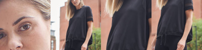 Oversize T, mesh back yoke and sleeve panels, draw cord hem with panel, lightweight soft hand feel fabric, tear-out label.