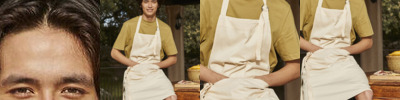 Full bib apron. Deep front pocket. Cotton Herringbone neck tie with sliding adjustable buckle. Cotton Herringbone 100cm waist ties. Fairtrade certified.