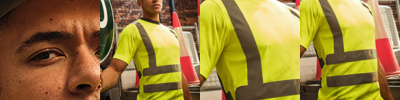 50% recycled polyester/50% polyester. Conforms to EN ISO 20471: 2013 + A1: 2016 class 2. RIS-3279-TOM (orange only). Soft touch, wicking micro mesh. UPF 40+ protection. Contrast ribbed collar. Taped neck. Two reflective bands on front, back and one over each shoulder. Side vents. Drop tail. Twin needle sleeves and hem. Branded tab on lower left side seam.