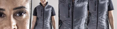 20D polyamide body panels. Made from at least 30% recycled polyamide. Contrast stretch soft shell side body panels. Lightweight recycled Thermo-Guard® insulation. Showerproof. Elasticated bound collar, armholes and hem. Full length zip with chin guard and inner zip guard. Right chest zip pocket with contrast zip pull. Two front zip pockets. Branded.