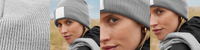 100% recycled polyester. Micro fleece lining. Double layer knit. Cuffed design. Cotton twill patch for decoration (5 x 5cm). Tear out label.