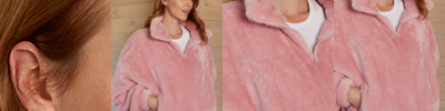 100% polyester. Plush fleece. Sherpa lined hood. Tie front. Two front pockets. Ribbed cuffs. Tear out label.