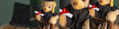 They did it! Mumbles proudly presents the Graduation bear, to help celebrate their academic achievements in further education. Wearing a gown (removable, for ease of decoration) and a cap with tassel, this bear makes an appropriate graduation gift, proudly holding a scroll with red ribbon. Features traditional glass eyes. Complies with EN071 European Toy Safety regulations. Remove all hang tags and their fasteners before giving these items to a child. Suitable from 36 months. Height: 23cm. REACH IS09002.