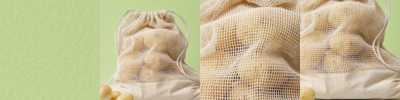 100% Recycled cotton. Rope drawcord closure. Mesh main body. Cotton panel for easy decoration. Multipurpose use. One size. Food safe.