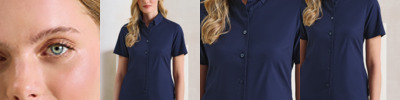 72% cotton/25% organic cotton/3% elastane. Mercerised cotton. Soft feel stretch fabric. Button down collar. Back darts. Curved hem. Available in long sleeve PR384.