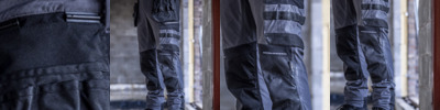 92% nylon/8% elastane. Four-way stretch. Hardwearing stretch ripstop panels. ATL durable showerproof finish. Laser cut ventilation. Slim fit. Part elasticated waistband with belt loops. Zip with metal shank button over. Detachable holster pockets. Crotch gusset. D-ring. Multi-use front pockets. ID holder. Hammer loop. Ruler pocket Rear pockets. Cordura® bottom loading knee pad pockets. Reflective detail. Triple stitched seams. Extendable leg ends short 29" to reg 31". Knee pads available RG282.